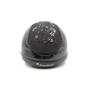 Miss Shield Glossy i svart med blomster Swarovski-smykker på toppen og frontbåndet. Blason og kant i mattsort.